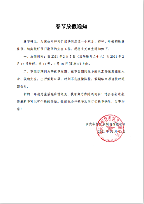 2021華恒儀表公司春節(jié)放假通知