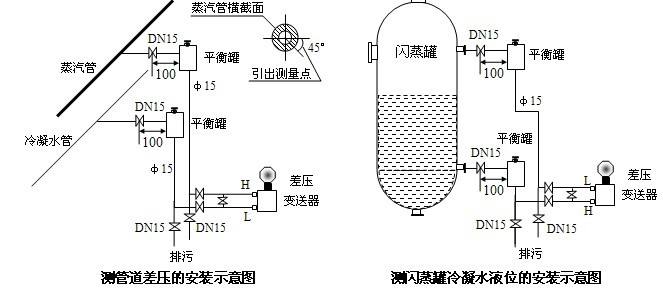 2、測(cè)量液體流量時(shí),差壓變送器應(yīng)安裝在被測(cè)管道的旁邊或下面,以便氣泡排入管道中;或上面,以便積聚的液體容易流入管道中;下面,以便冷凝水能充滿(mǎn)在引壓管中。